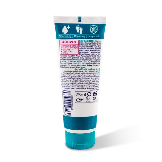 ترمیمکننده ترکهای پا، آبرسان و بهبوددهنده خشکی پوست پا، نرمکننده عالی و مغذی پوست، ضد التهاب و جلوگیری از عفونتهای قارچی، لایهبرداری ملایم و حذف سلولهای مرده پوست