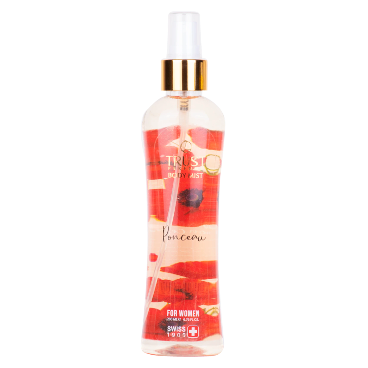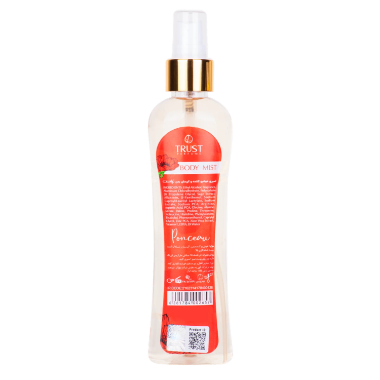 با رایحه گلی-میوهای بادی میست زنانه تراست مدل Ponceau، طراوت و تازگی را روی نبض خود احساس کنید. این محصول، بانوان با اعتماد به نفسی را هدف قرار میدهد که مایلند رایحهای جذاب و جدید را امتحان کنند. در ابتدا رایحه انار، هلو و سیب را پراکنده میکند که با عطر گل همیشه بهار و پئونی تلفیق شده است. در نهایت رایحه وانیل، مارشملو و چوب بلوط را روی پوست باقی میگذارد.