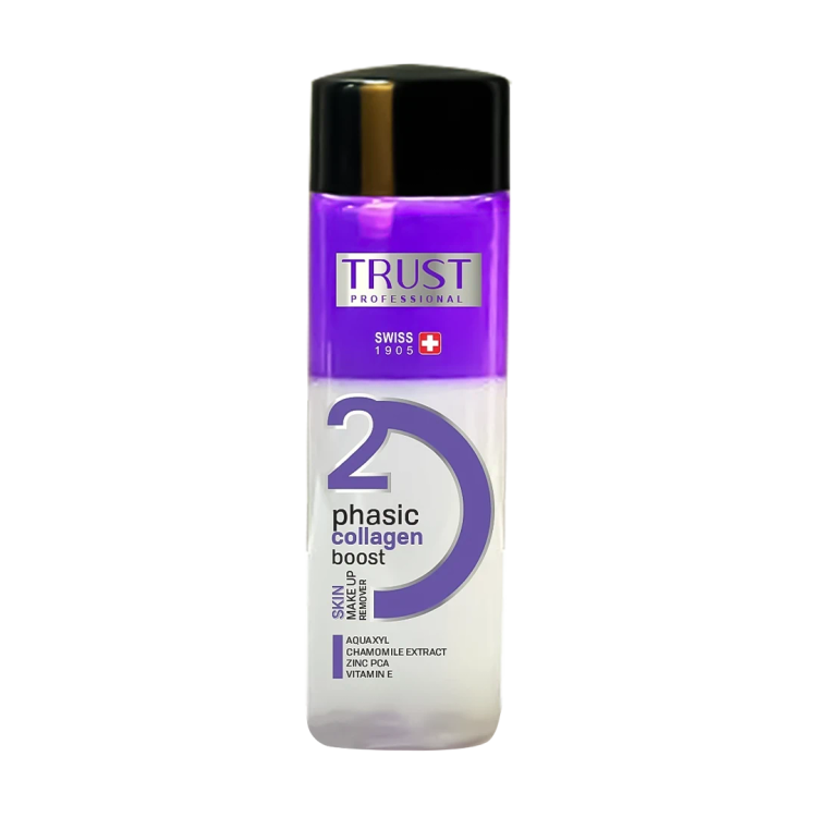 محلول پاککننده آرایش دوفازی تراست، تمام آلودگیها و مواد آرایشی معمولی و ضدآب را از پوستمان پاک کرده و اثری از آنها به جای نمیگذارد. این محصول با وجود ماده مؤثره پروتئین هیدرولیز شده کلاژن از پیری پوست جلوگیری کرده، باعث استحکام پوست و جلوگیری از باز شدن منافذ پوست می شود. محلول دوفازی ضمن پاککنندگی پوست به خاطر داشتن ماده مؤثره آکواکسیل در ساختار خود، پوست را آبرسانی کرده و مانع از تبخیر آب پوستی میشود. همچنین با داشتن عصاره بابونه و ویتامین ای در ترکیباتش از التهابات پوستی جلوگیری کرده، آن را نرم و باطراوت میکند و مانع از آسیب رادیکالهای آزاد به پوست میشود. زینک پی سی ای در فرمولاسیون محصول ترشح سبوم را کنترل کرده، منافذ پوستی را جمع کرده و از ایجاد جوش و آکنه روی پوست جلوگیری میکند. در ضمن عصاره روغن بادام در این محلول دوفازی تراست به آبرسانی، تقویت پوست و پاکسازی کامل مواد آرایشی از روی پوست کمک شایانی میکند.