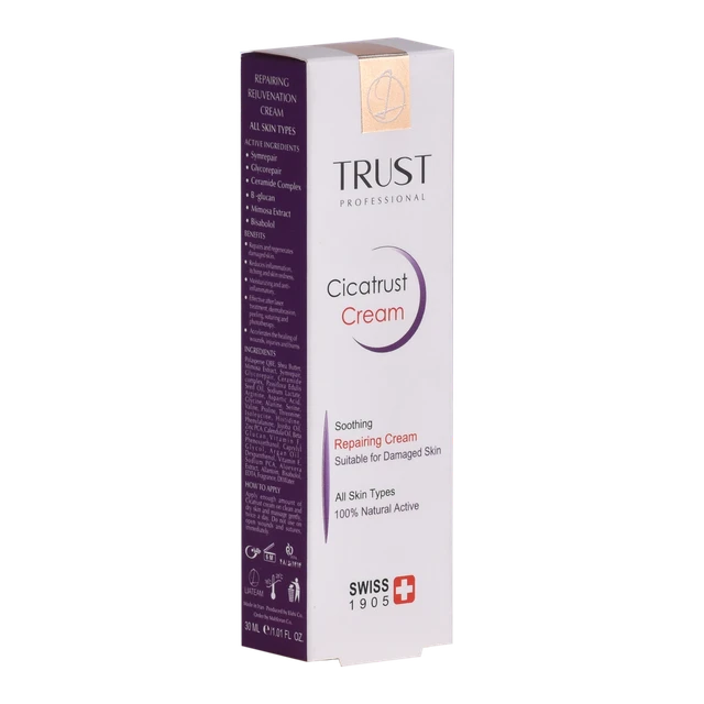 کرم ترمیم کننده تراست مناسب ترمیم پوستهای آسیبدیده و درمان انواع آسیبهای پوستی است. مواد مؤثره موجود در این کرم باعث تحریک به تکثیر سلولهای پوستی و ترمیم آسیبهای واردشده به پوست میشوند؛ این کار را نیز با افزایش انقباض عضلات اطراف ناحیه آسیبدیده، کمک به جمع شدن زخمها و بهبود سریعترشان انجام میدهند. وجود ترکیبات فعال گیاه براسیکای این محصول، از رشد باکتریها و قارچها جلوگیری کرده و از طریق اولیگوگالاکتومانان جلوی التهاب، قرمزی، خارش و سوزش پوست در ناحیه آسیبدیده را میگیرد. همچنین مصرف این کرم با داشتن ترکیبات فعال سرامیدی به آبرسانی پوست هم کمک میکند.